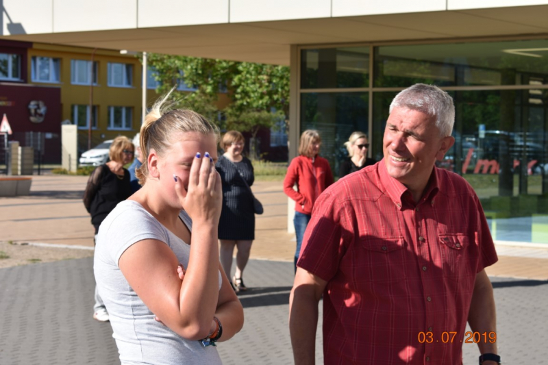 Angelika Hanke und Martina Busch hatten die Aufgabe, bestimmte Kleidungsstücke wie schwarze Jacke und pinkfarbene Strümpfe und Accessoires wie Ketten und Ringe von den Zuschauern zu besorgen. Sportlich mussten sich dagegen Michael Läubin und Michael Cop betätigen. Sie traten gegen zwei Zehntklässler im Bobbycar-Rennen an, während Harald Kossurok und Uwe Bake im Büchsenwerfen ihr Glück versuchten. Die letzte Aufgabe war für die Klassenlehrer Anne Baumgarten (a) und Dirk Otte (b) bestimmt. Sie mussten ihre Schüler anhand von Kinderfotos erkennen. Ein toller Spaß für beide Seiten. |